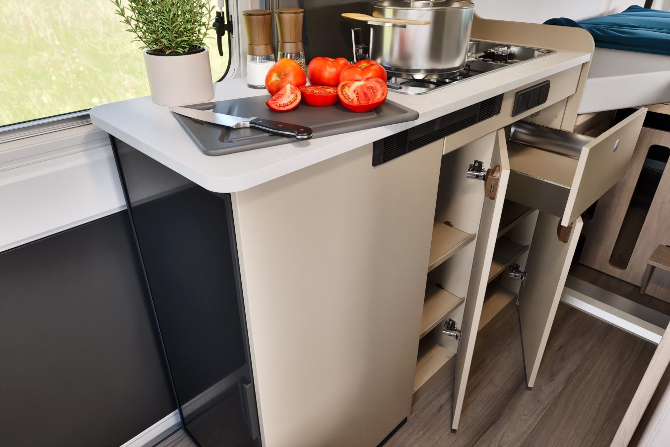 Er is er plaats voor vier inzittenden (inclusief 2 x Isofix). Dankzij het formaat van 6,36 meter is manoeuvreren en parkeren eenvoudig, vooral met de handige achteruitrijcamera. Navigeren doe je gemakkelijk via Carplay op het grote scherm. Door opties zoals climate control, adaptive cruise control, lane assist, LED koplampen heb je een luxe rijervaring. Verder kun je op de lage fietsendrager met zwenkarm twee elektrische fietsen kwijt (60 kg). Hierdoor hoef je de fietsen niet hoog te tillen en heb je altijd makkelijk toegang tot de achterdeuren en bagageruimte.